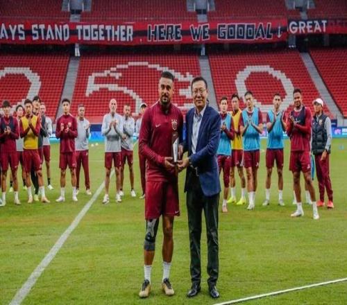 海港今日训练前,党总支书记沙良昌为李帅颁发百场纪念球衣
