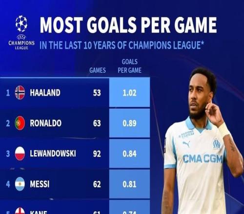 近10年欧冠场均进球榜:哈兰德1.02球第1,C罗第2,梅西第4