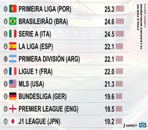 当地时间10月13日,瑞士足球天文台统计了各国联赛每90分钟的犯规情况,其中葡超以25.3次犯规位居榜首,巴甲以24.6次位列第二,意甲以24.5次位列第三。