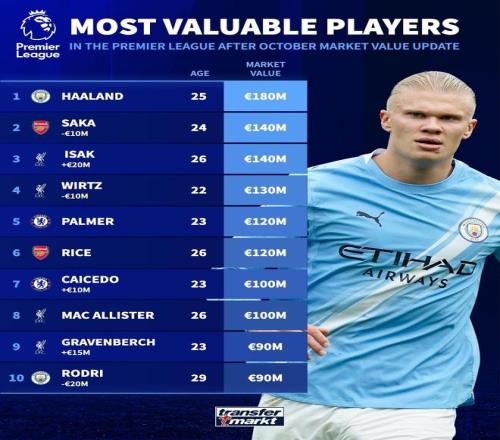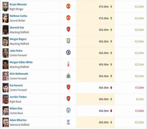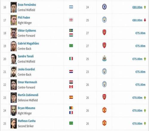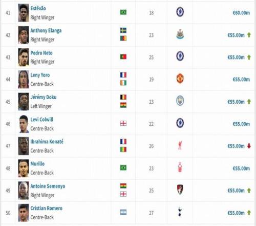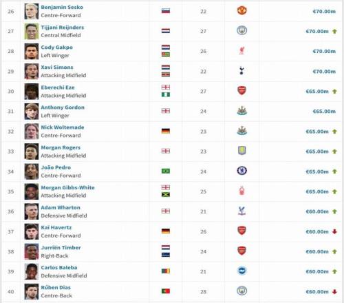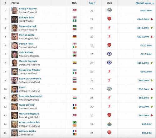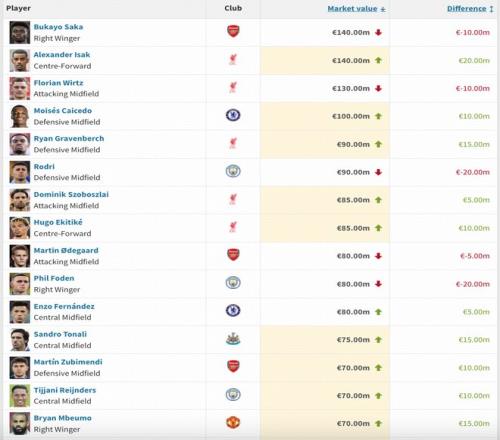 英超身价变更:维尔茨降至1.3亿欧,萨卡降至1.4亿欧,凯塞多升至1亿欧 懂球帝 2025-10-17 22:00:57 英超身价变更:维尔茨降至1.3亿欧,萨卡降至1.4亿欧,凯塞多升至1亿欧英超身价TOP10英超身价TOP50英超本期重点身价变更更多消息,稍后带来。 维尔茨凯塞多英超冠军苏拉祖·萨卡 上一篇: 邮报:阿莫林给B费等球员额外休息,让多名小将随一线队合练下一篇: 斯科尔斯:肖、马奎尔和卡塞米罗身体下滑严重,踢不了英超了