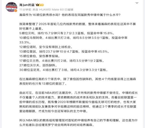 媒体人:瀚森在同届内线新秀中不算最差,当前打法不待见中锋