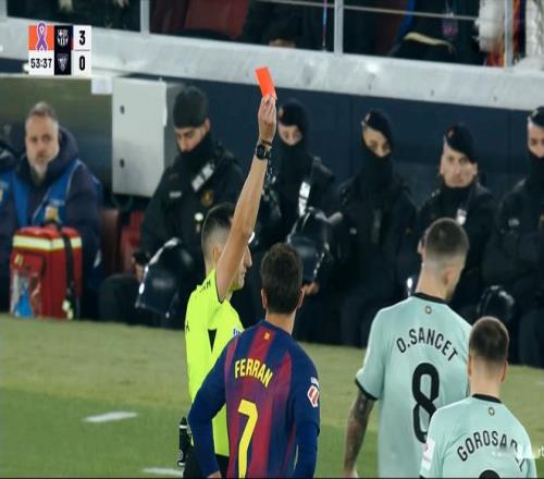 下半场回来,巴塞罗那抢开局的意图非常明显,保持前场高压的逼抢。埃里克加西亚抢断、直塞,费尔明拿球劲射破门,3:0!再度丢球后,毕尔巴鄂竞技球员的心态出现了失衡,桑切特暴力铲倒费尔明,险些引发冲突,裁判经过视频回放之后,直接出示红牌将其罚下!大比分落后,场面又少一人,毕尔巴鄂竞技基本追分无望了。