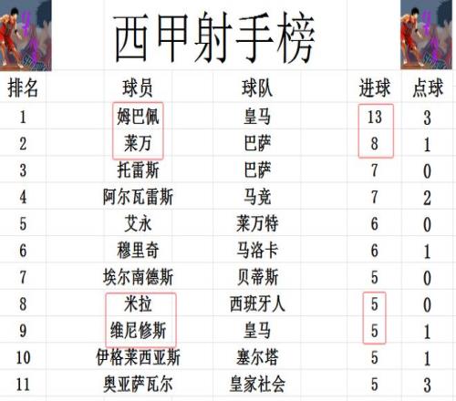 射手榜方面,姆巴佩13球领跑,莱万8球位居第2,托雷斯和阿尔瓦雷斯7球并列第3。米拉今天打入一球后,追上维尼修斯,奥亚萨瓦尔,伊格莱西亚斯等人,5球刚好挤入前十。