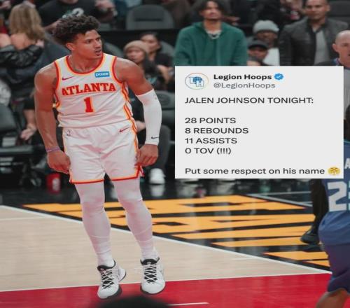 23岁的杰伦-约翰逊也成为1999年以来单场至少拿到25分10助攻0失误最年轻的前锋球员。
