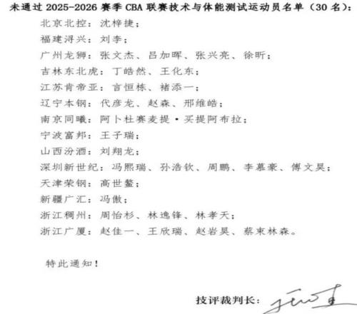 目前,20支球队的球员已经完成了体测,结果,有30名球员没有通过本次体测,接下来,他们将会进入补测。假如,补测不通过,那么,将会错过CBA常规赛前十五轮的比赛。
